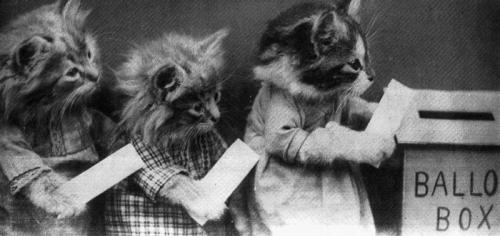 5. Hey everybody, I'm MeatPuppets, and I'm an alcoho- I mean, I'm new here. I've browsed the forums looking for people in need of zombies players before, but now I've finally decided to get on my lazy ass, open my laptop, and register an account. I've got a Playstation 3, along with Call of Duty World at War, Black Ops, Black Ops 2, and all of the map packs for each of them. Hopefully I can find some people on here to play with at some point! I have no idea what else to put here, so please enjoy this picture of kittens voting in the 1920 election after the succesful (but grossly undocumented) feline suffrage movement of the early 20th century.