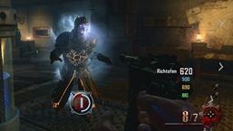 The Panzer Soldat is a new boss zombie. He first spawns on Round 8 and then shows up again every few rounds. He is very dangerous and can kill you either by hitting you at point-blank, shooting you with his flamethrower or by grabbing and reeling you in with his claw. His only weak spot is his head. If playing Solo you will only encounter one Panzer at a time. When killed, he drops a piece of the Fire Staff the first time, then a random power-up each time after that.